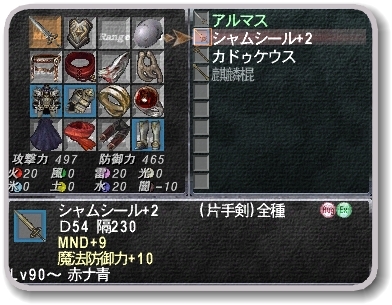 | 2356 | シャムシール+2 ● (D54 隔230 Lv90) MND+9 魔法防御力+10 |