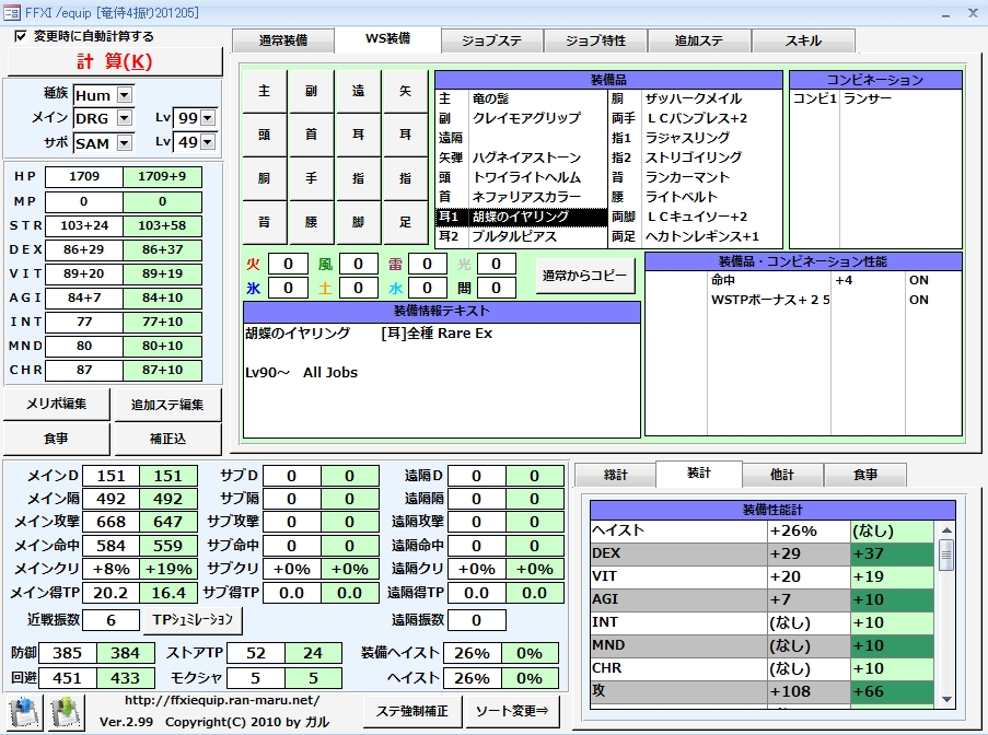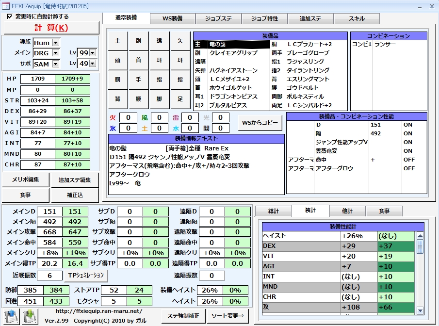 そして雲蒸竜変には20%前後の攻撃力マイナス補正がついておりWS装備も攻撃力をブーストするのが好ましいと言われていたので双方とも攻撃力ブーストした装備で撃ってました。