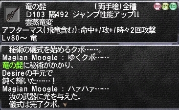 | その他 | 飛命6 ファストキャスト+3% トリプルアタック+1% 飛竜HP+50 時々被魔法ダメージ吸収 |