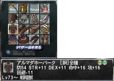 オーラムキュイラス:胴◆防55 STR+8 DEX+8 VIT-8 AGI-8 攻+15 ストアTP+7 戦ナ暗獣竜 Lv72 RaEx