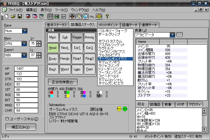 アスカルコラジン:胴◆防49 STR+5 攻+12 回避+12 ダブルアタック+2% ストアTP+5 コンビネーション:HPmax+ 戦ナ暗獣侍竜 Lv75 RaEx