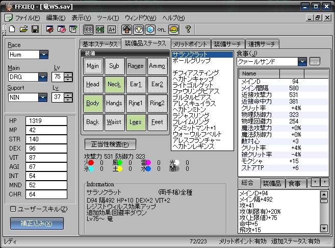 参考までに自分の雲蒸竜変用装備、食事は猫サンドです。